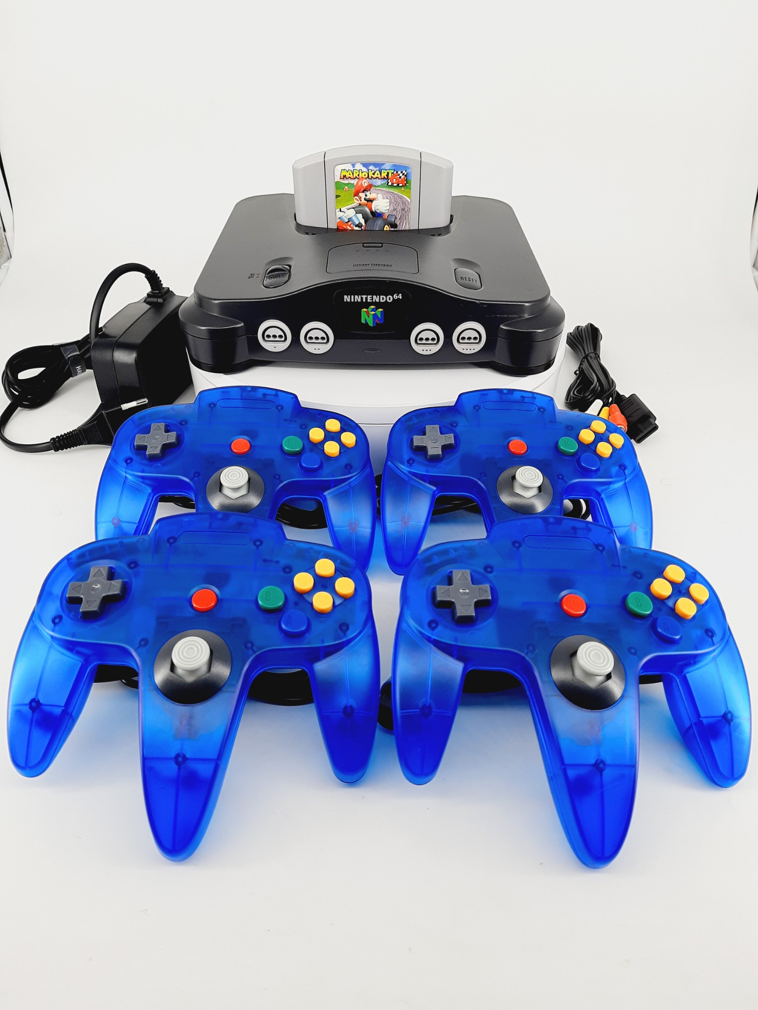 Nintendo 64 Konsole + Mario Kart 64 mit 4 Controller für N64 in Transparent Blau